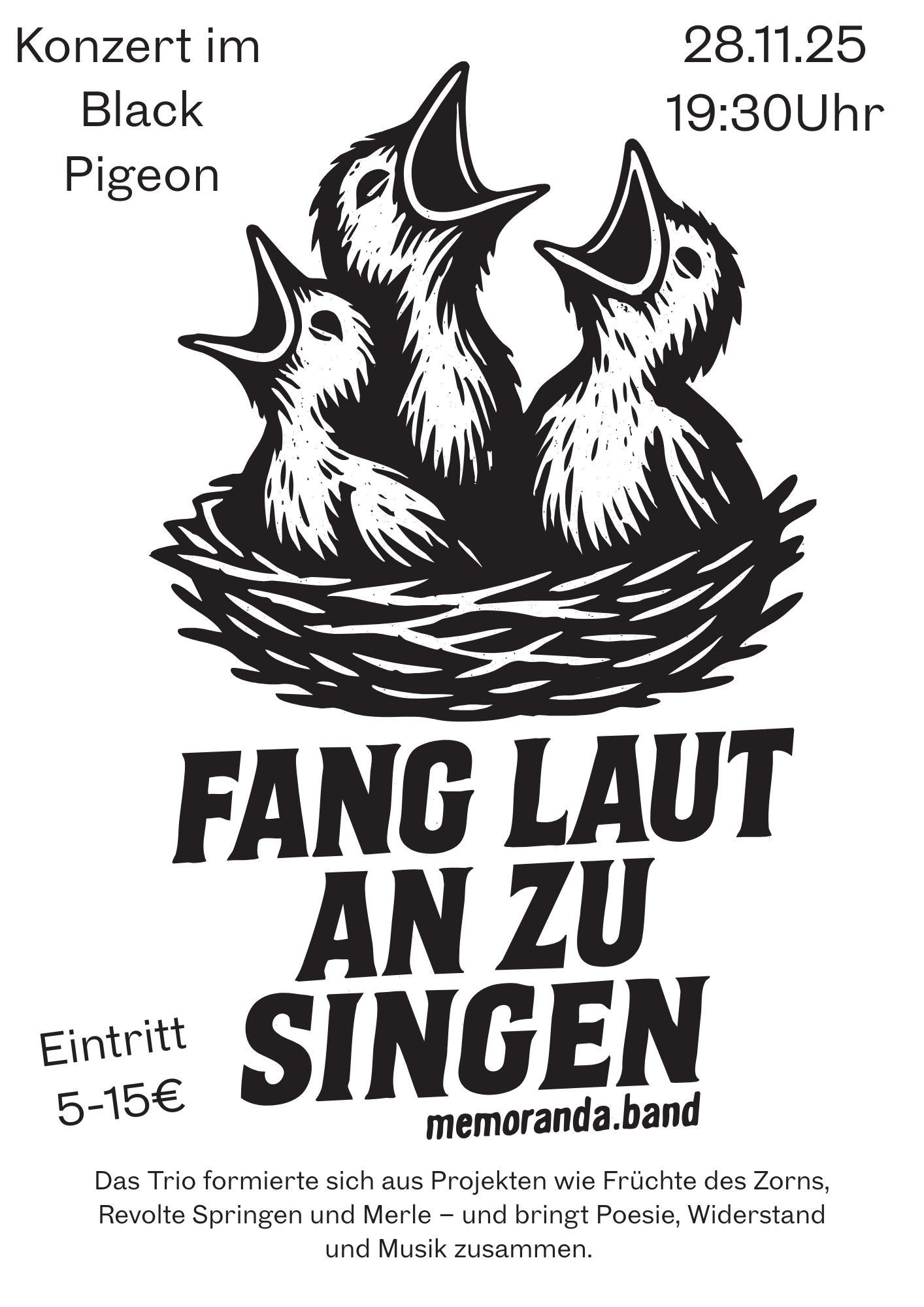 Memoranda verbindet Cello, Gitarre, Klavier, Schlagzeug und mehrstimmigen Gesang zu Liedern, die zugleich zart, klar und kämpferisch sind. Das Trio formierte sich aus Projekten wie Früchte des Zorns, Revolte Springen und Merle – und bringt Poesie, Widerstand und Musik zusammen.