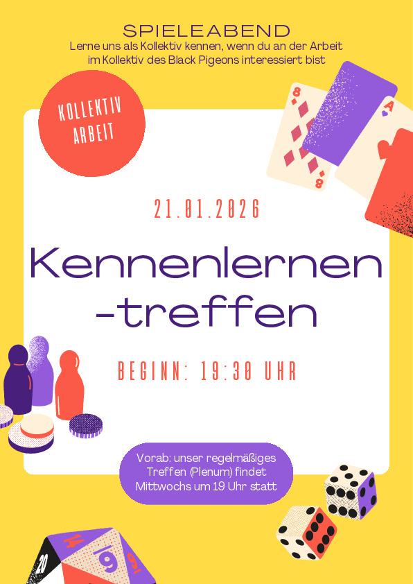 Am 21. Januar ab 19:30 Uhr freuen wir uns über Menschen, die am Kollektiv interessiert sind und mit uns ins Gespräch kommen möchten.